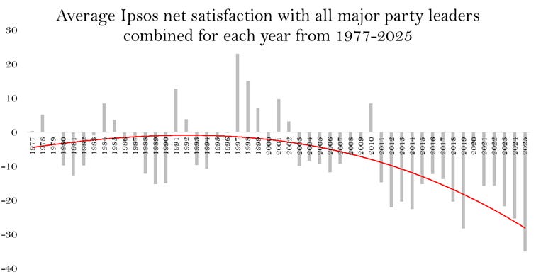 The chart below shows this. It’s deduced by averaging Ipsos’s net approval ratings, for all major party leaders in each year, going back to 1977. It shows a slow-motion collapse, which Starmer is at the tail-end of. This has coincided with big changes in the media environment, and began in earnest after the expenses scandal. The direction it points towards is unsustainable for a democracy.